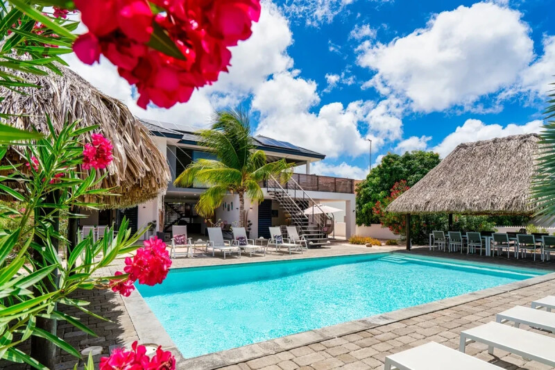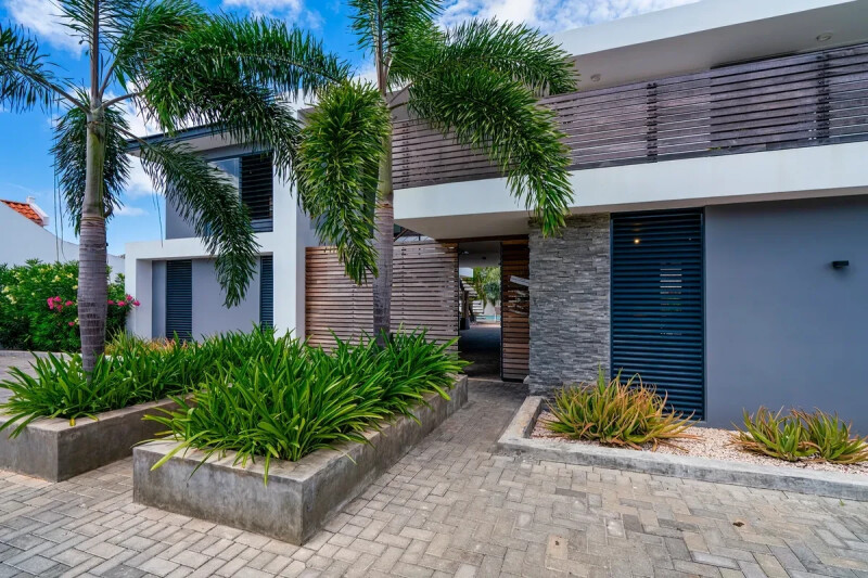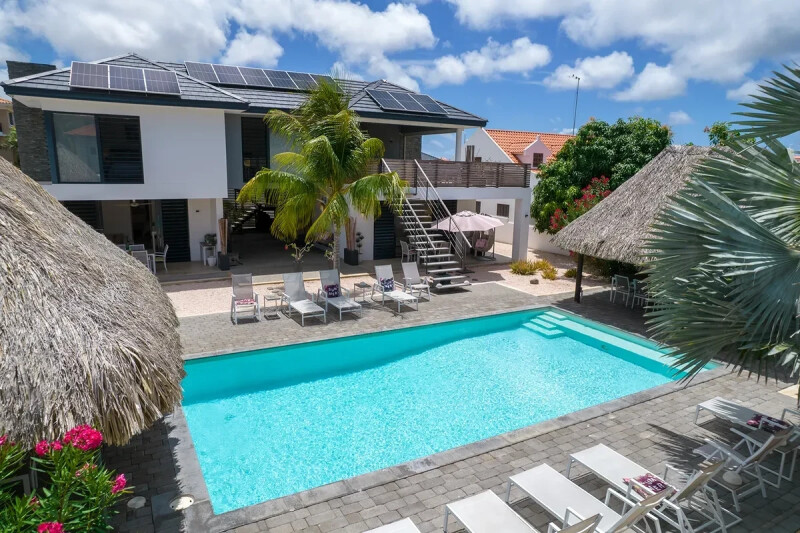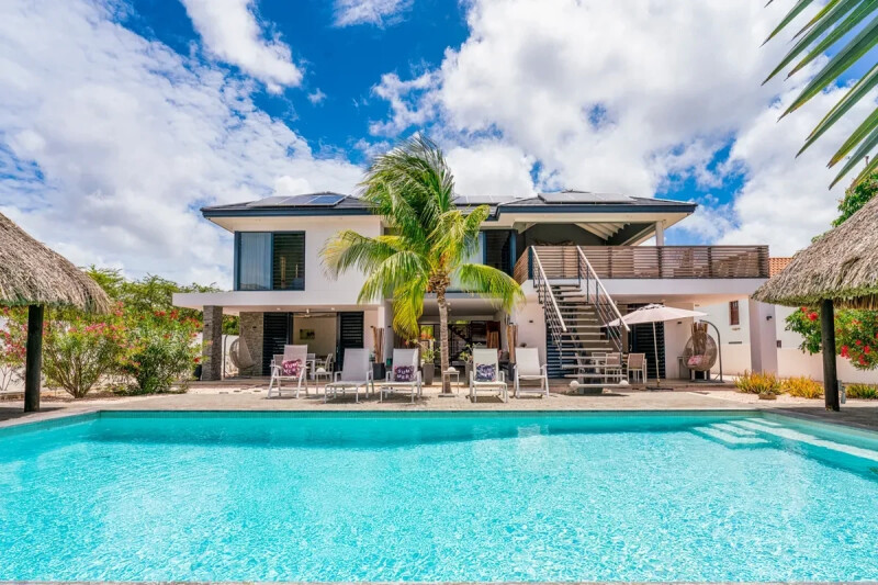 A covered terrace with views over the Caracasbaai and Spanish Water connects back to the pool deck below. Along with high end appliances the property is built with top quality materials such as Vermaas shutter windows and hurricane resistant storm glass, retractable sunshades at the upper covered terrace. Furnished with Bellagio and Manifesto it provides comfort along with the modern luxuries as outdoor Wi-Fi. Energy saving features are solar panels and a 31 m² deep well.